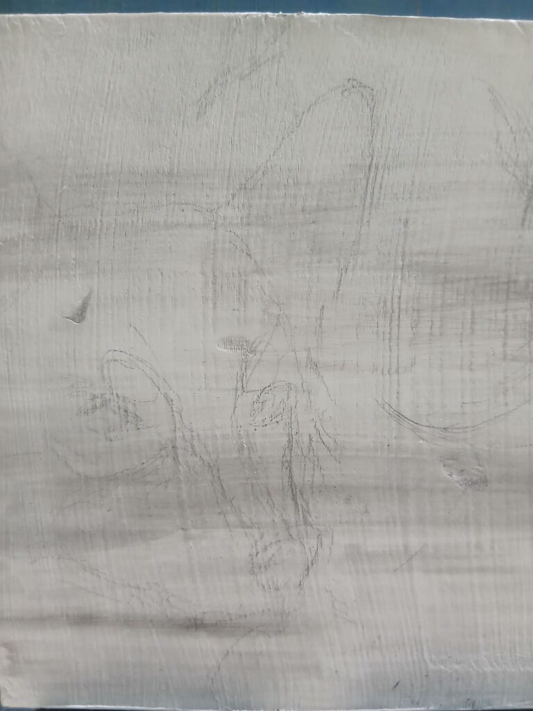 鉛筆で下書きしたらフィキサチーフ(定着剤)を吹き付け、乾いたら全体をアイボリーブラックで塗ってみました。水を加えすぎたようです。