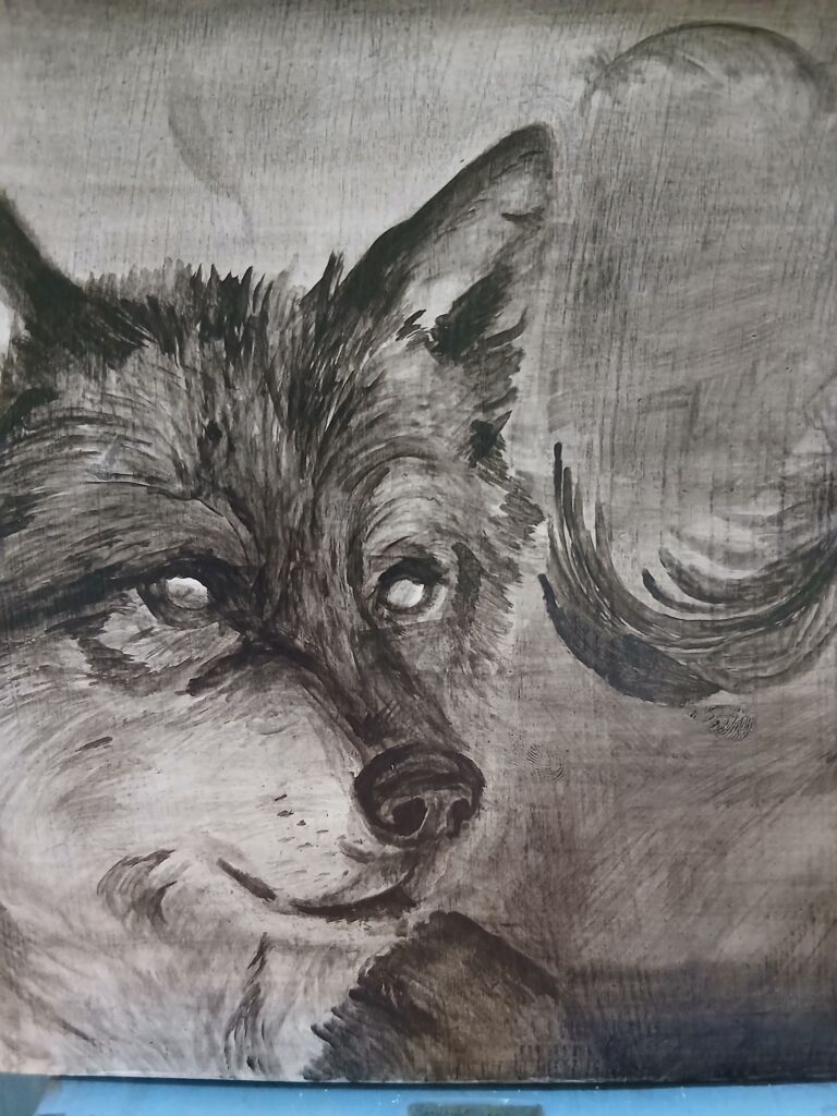 薄く目、鼻を描きこんでいきます。モデルは触れる動物園の狼です。迫力が欲しかったんですが可愛い子でした。
