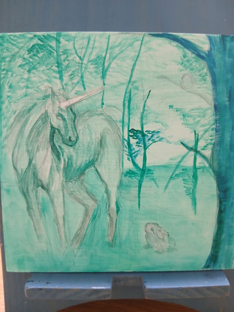 うさぎの色が薄くなったように見えます。これぞ錯覚。右の木は絵の具多めでボコボコ描きます。