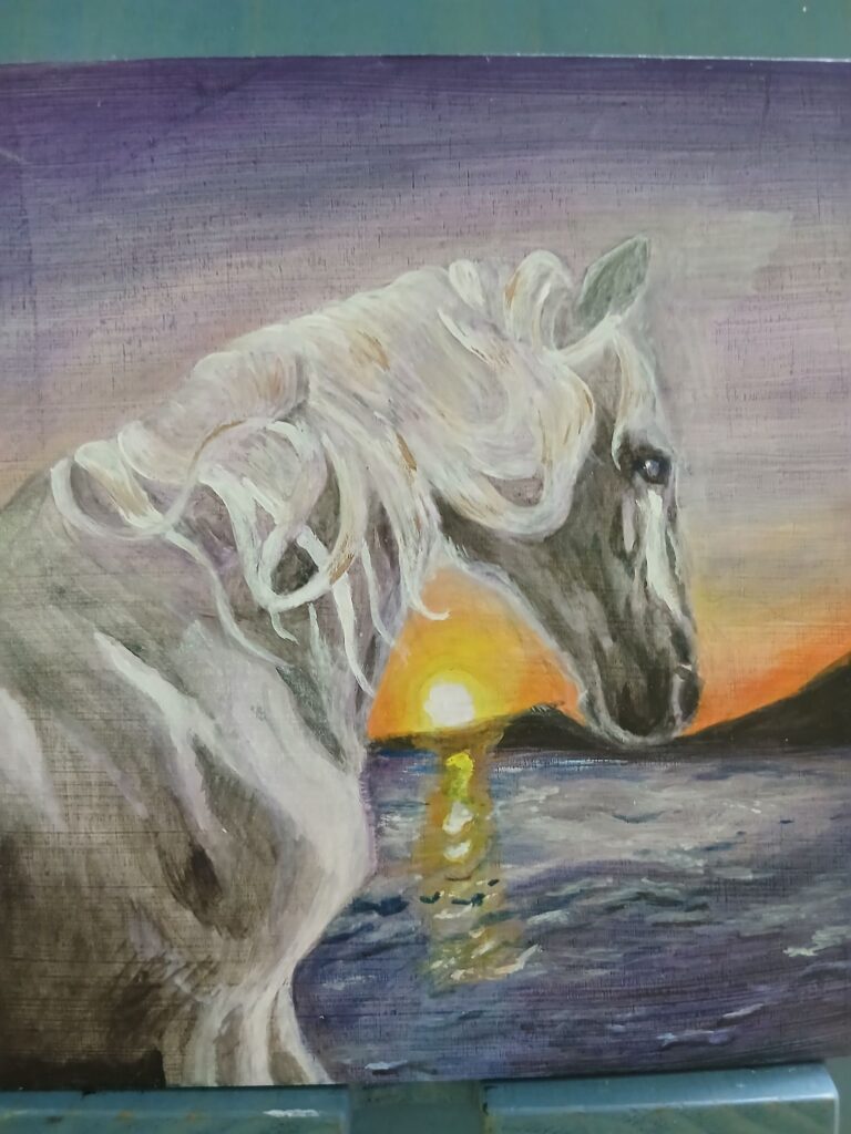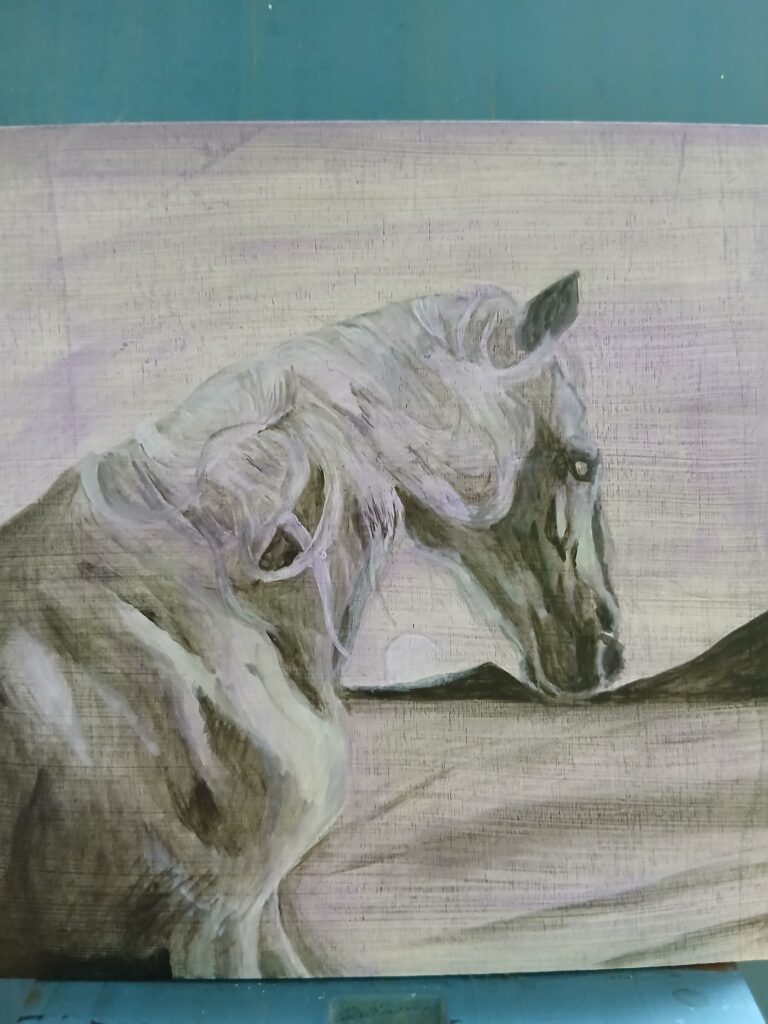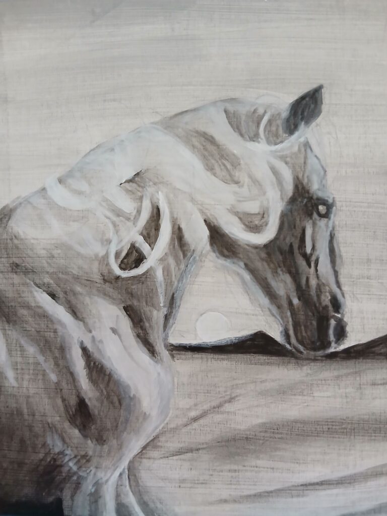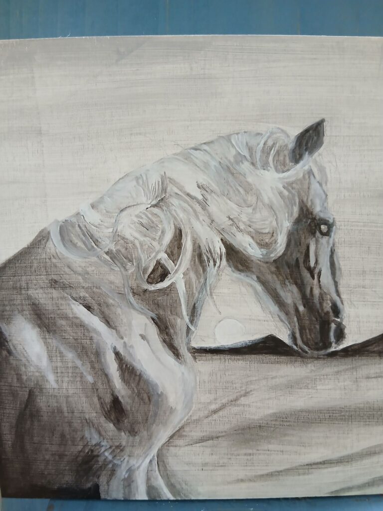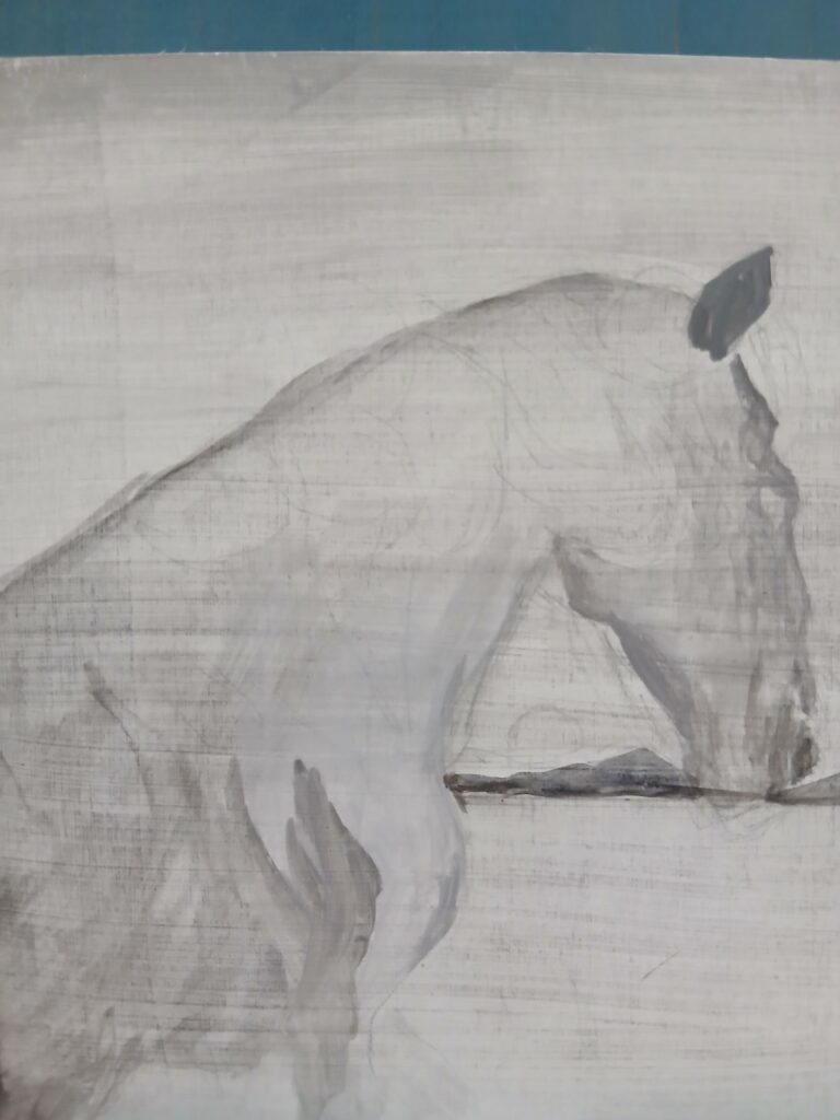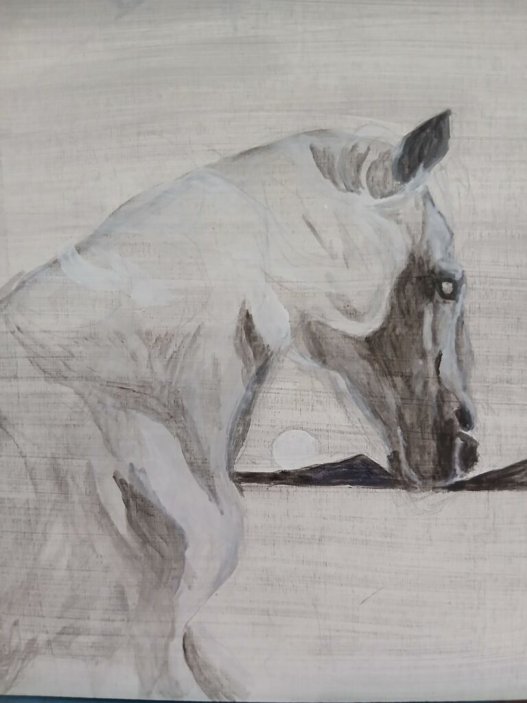 本日はグリザイユ(白黒)で馬を描いていきたいと思います。白馬と言うよりアーハルテッケのような金色に近い雰囲気で描ければいいな、と思っています。