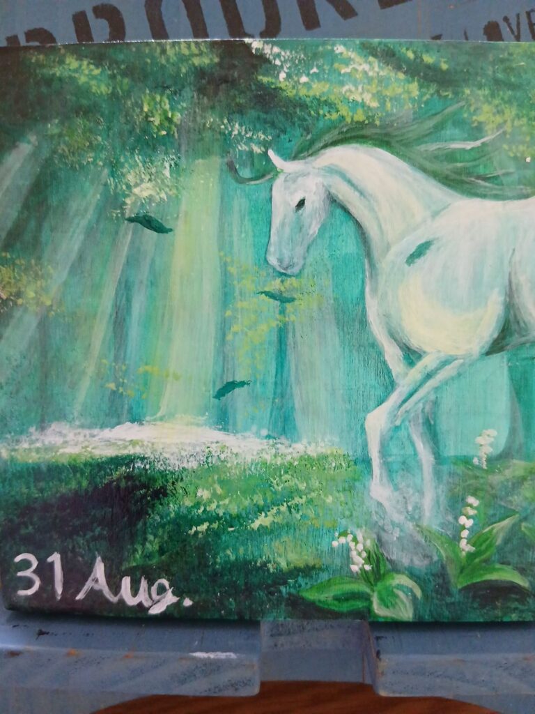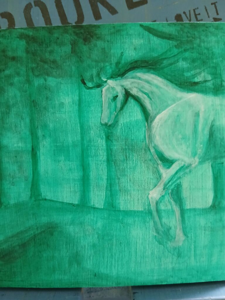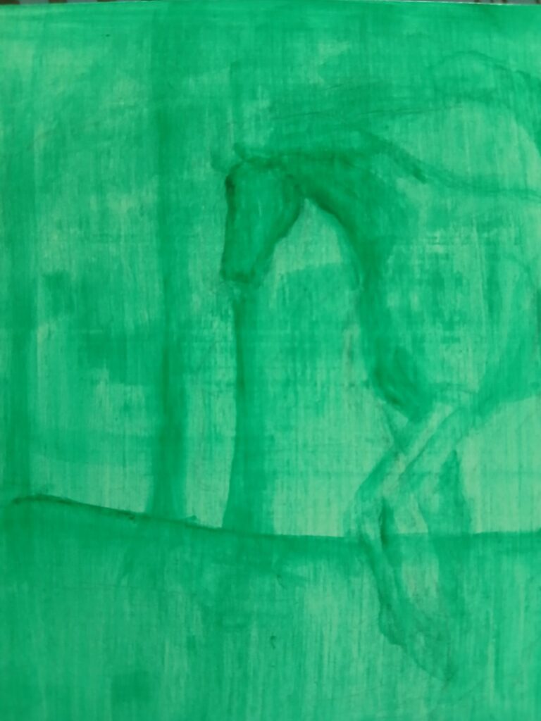 グリーンに少し黒を入れてます。光源は斜め上。馬の額に強く光が当たると考えて描いていきます。