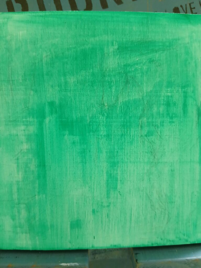 ジェッソを3回塗ってから紙ヤスリでならし、鉛筆で下書き。グリーンを全体に塗ります。